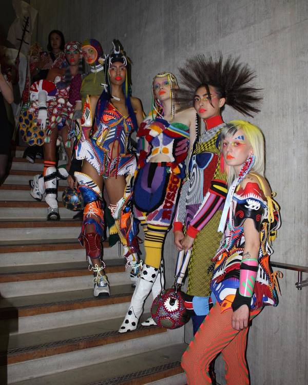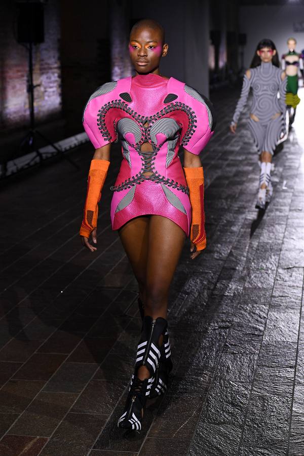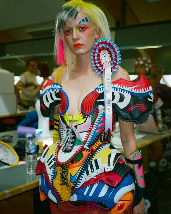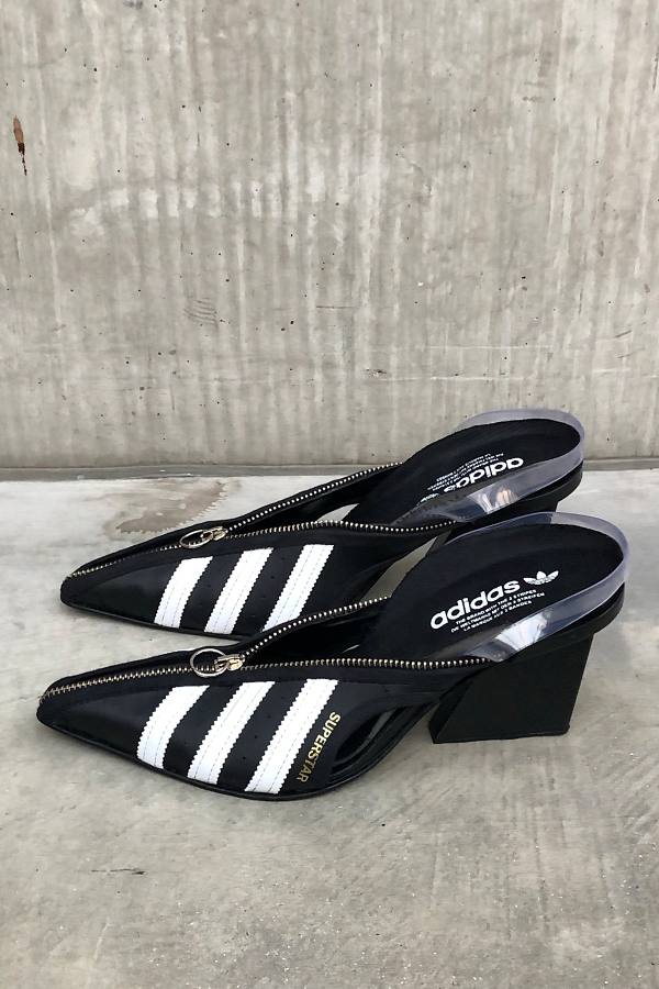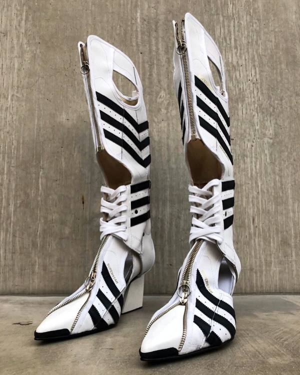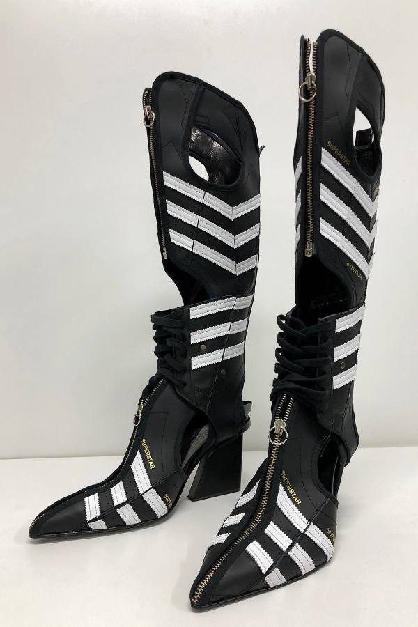 Com tanto sucesso, o corpo docente da Saint Martins elegeu a artista para representar a faculdade no London Fashion Week. Em sua estreia no evento, a canadense resolveu utilizar a técnica de upcycling para compor os acessórios da coleção. Para isso, ela recorreu às expertises do colega Marko Baković, que desponta na moda europeia por criar calçados cheios de design e inovação. A dupla desenvolveu botas over the knee e mules a partir do modelo Superstar, que acaba de completar 50 anos. A Superstar Boot e a Superstar Mule ostentam saltos altos, as listras triplas que marcam os produtos da label esportiva, zíperes prateados e, não à toa, as logos e palmilhas originais do modelo.
